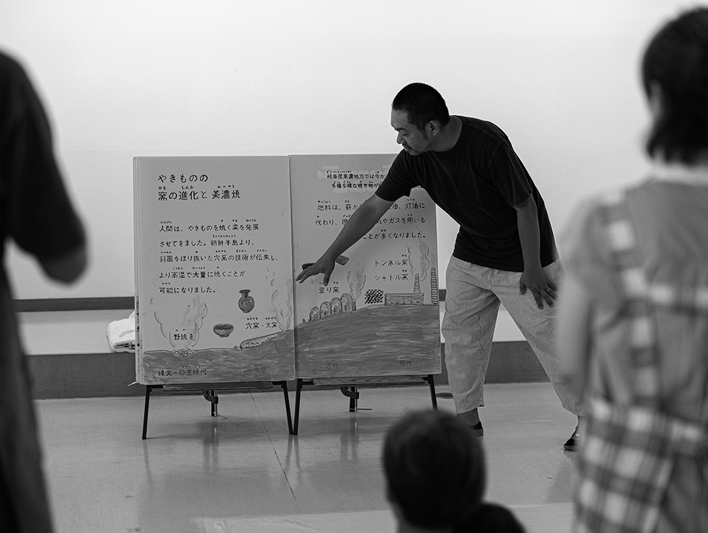 事前リサーチとして、東美濃に拠点を構えるカネ利陶料有限会社会長の岩島利幸さんによる案内のもと、鉱山を見学。かつては湖の底だったという1000万年前から500万年前の地層の土に直に触れる機会を得た。また、多治見市で水月窯を営む水野繁樹さんを訪ね、敷地内にある土から焼き物をつくる過程も教わった。こうした体験を踏まえて企画したプログラムは、現地の土を使った土染めワークショップ。最初にデザイナーの高橋孝治さんが、美濃地域の土の成り立ちを特製の巨大絵本で説明。土について知り、土に触れながら学びを深められるような構成とした。参加者は、8種類の原土(提供:カネ利陶料有限会社、水月窯)のなかからお気に入りの土をひとつ選び、細かく砕いて水を加え、顔料にして布に揉み込んでいった。学芸員からは、「この土地だからできること、地域の特性を生かすこと、参加者に何を体験してほしいかを考えることが、今後のよりよい活動につながっていく」といった声があった。