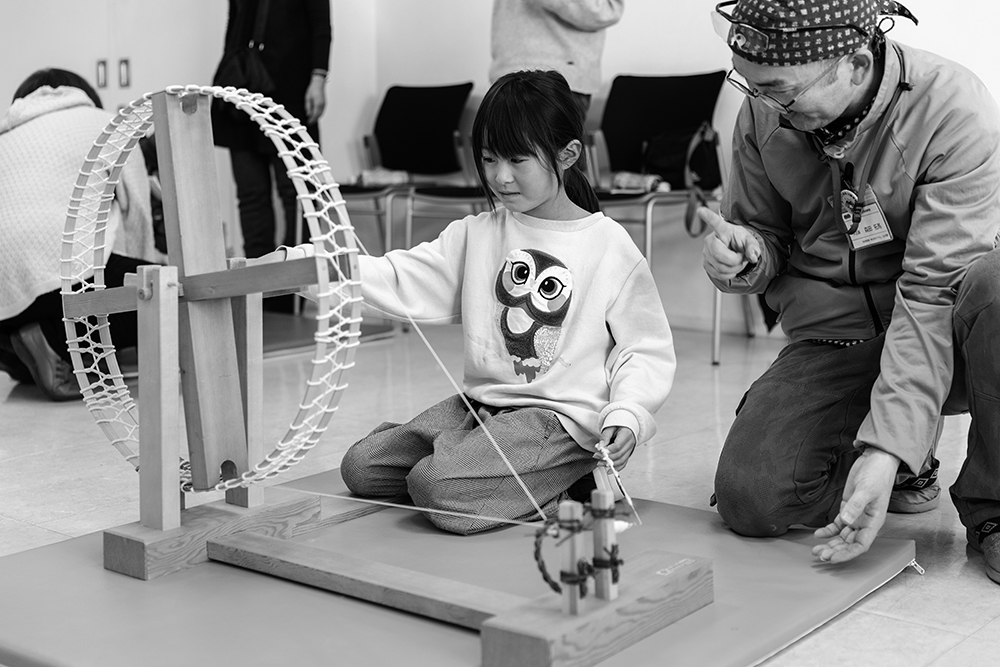 TSURUMIこどもホスピスで開催されている、重度の障害や疾患のある子どもたちが普段できないことを体験するイベントにあわせて実施した。ホスピスからの「内容はシンプルに、子どもと対等に向き合えるような環境に」という希望を受け、プログラムは、遊びやすくつくりやすい京こまづくりと、五感で楽しめる工芸品・おりんの体験に決定。講師には、「京こま匠 雀休」の職人である中村佳之さんと、京都伝統産業ミュージアムの山崎伸吾さんを招いた。京こまは、色ひもや糸を竹軸に巻き重ねてつくる工芸品。中村さんが京こまの由来やつくり方を教えると、子どもたちは好きな色の紙を丸めて円盤状にする過程を楽しんだ。また、会場となる部屋の一角には、いろいろな音階のおりんも設置。体を動かすことが難しい子どもたちも、一緒に京こまの材料の色選びをしたり、おりんの音色を味わったりして参加した。さらに、会場まで移動できない子どもたちには、ホスピス内での出張ワークショップも開催。構造が複雑でなく、身近かつ安全な素材で構成され、つくったその場で一緒に遊べるコミュニケーションツールになる京こまの特性と、今回のプログラムとの相性の良さを感じた。